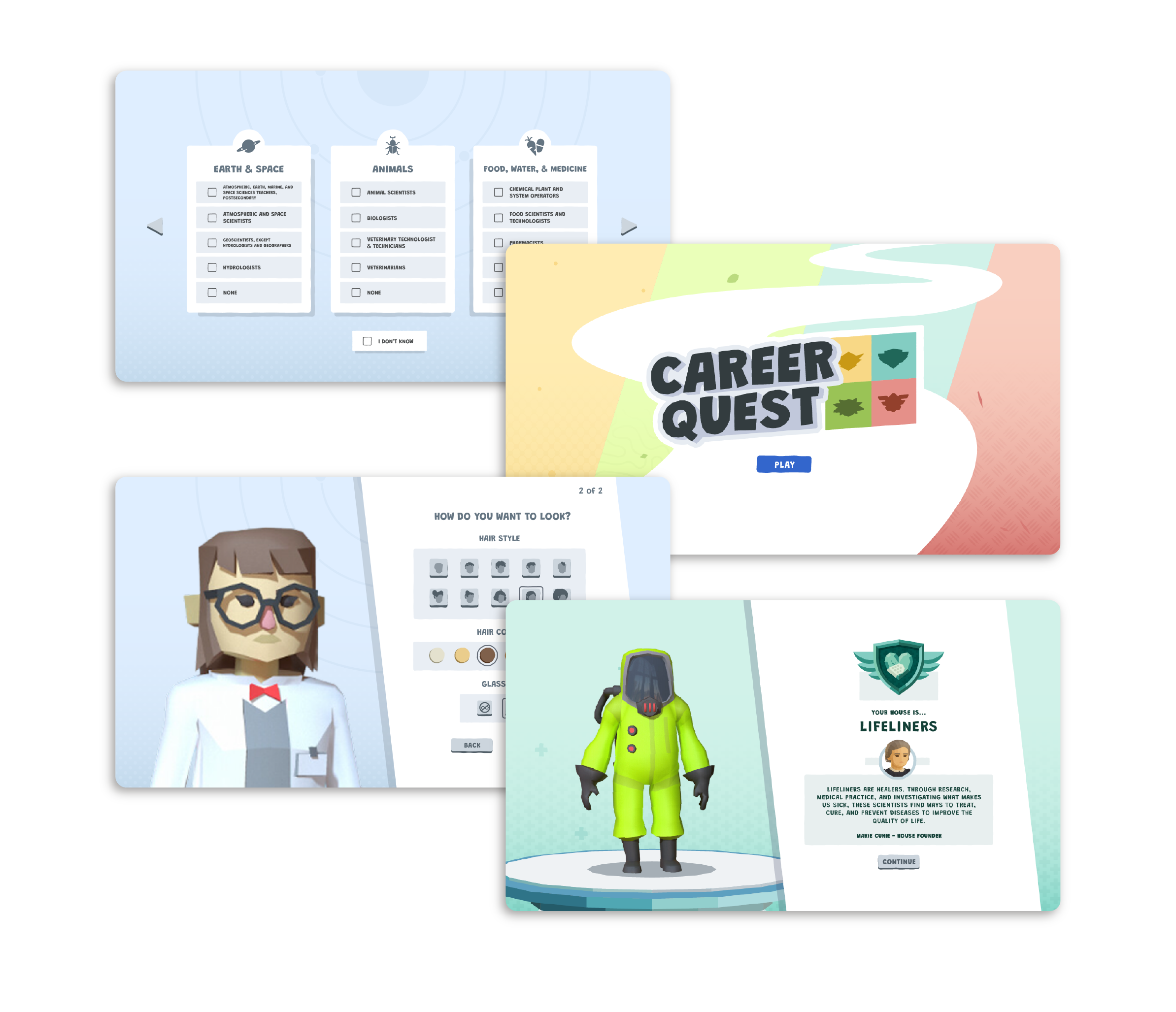 An activity where students are matched with personalized science careers by answering personality questions, all while creating unique customizable avatars. Responsible for UI/UX and 2D Artwork.