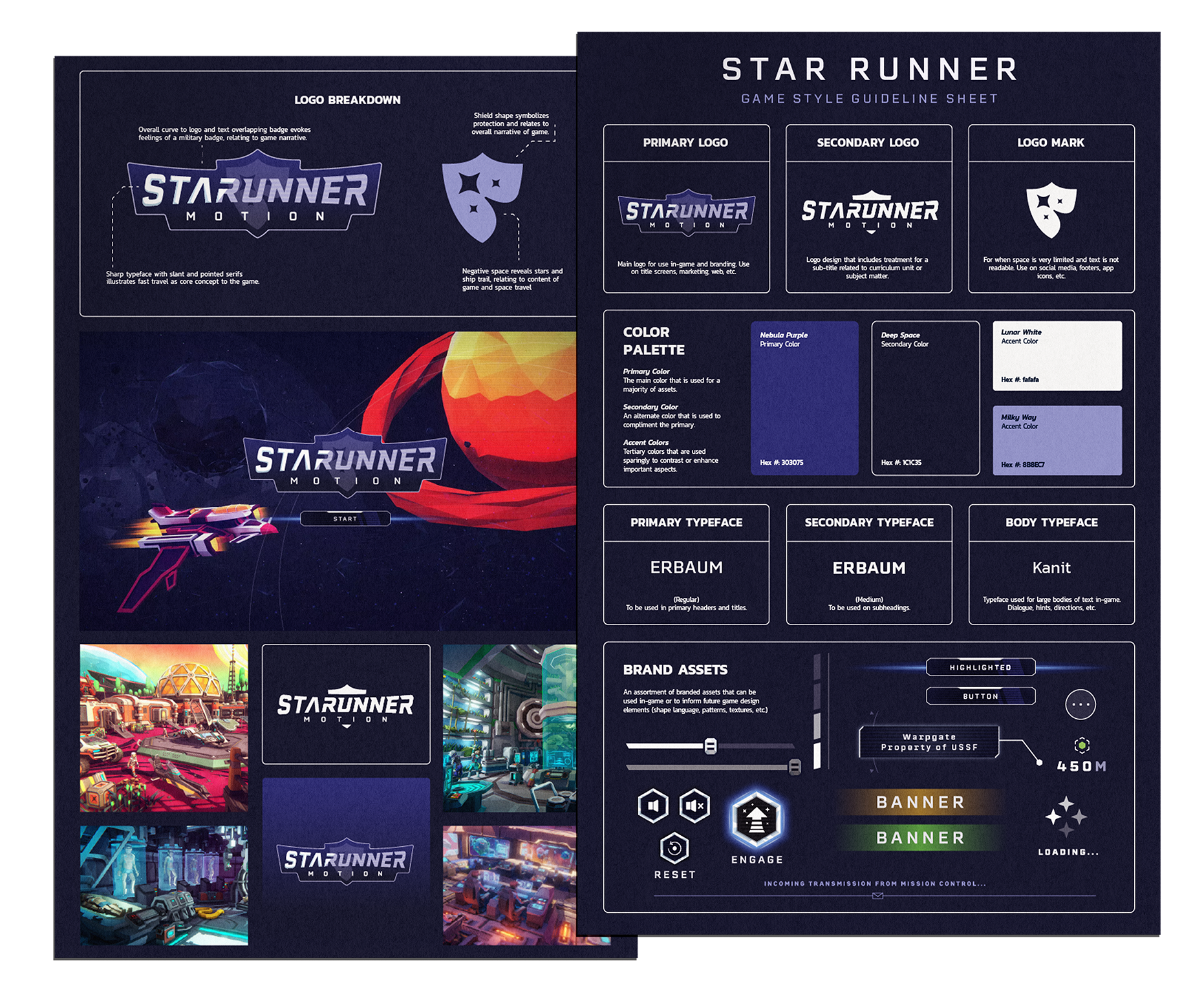 Knowing this, I was able to design a visual guide that determined all 2D reference needed for game development such as: Logos, Color Palette, Typeface, & UI Assets.
