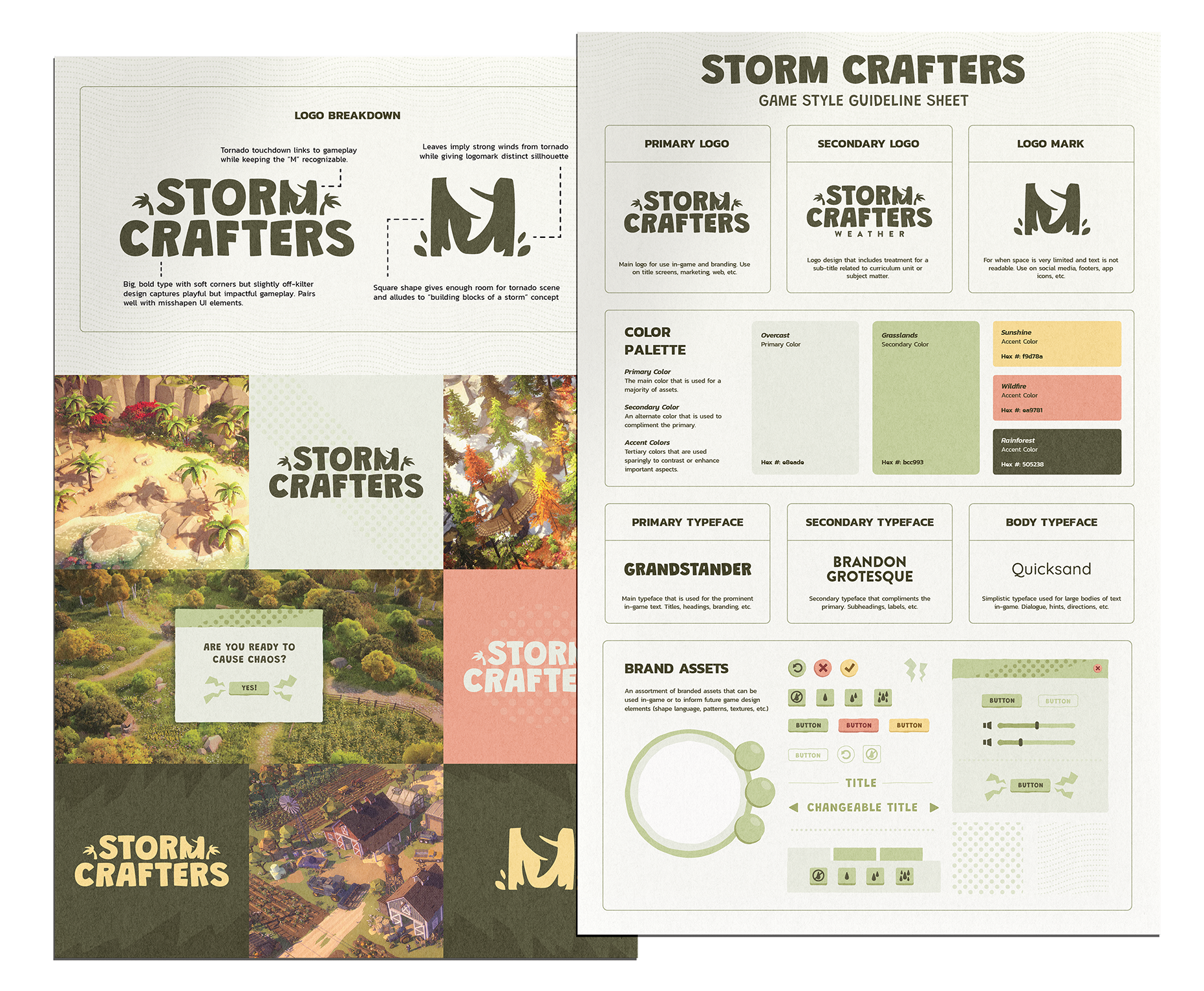 In order to bring the game to life, our team needed a style guide which would inform the overall visual language of the game. Collaborating with curriculum staff, I established the target audience and reduced the game to its core emotions: Playful, Lighthearted, & Impactful.