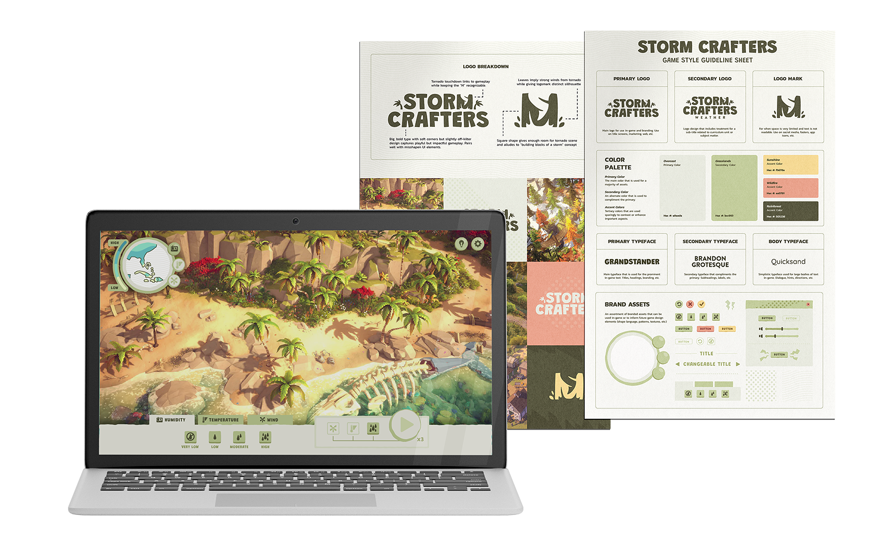 Knowing this, I was able to design a visual guide that determined all 2D reference needed for game development such as: Logos, Color Palette, Typeface, & UI Assets.